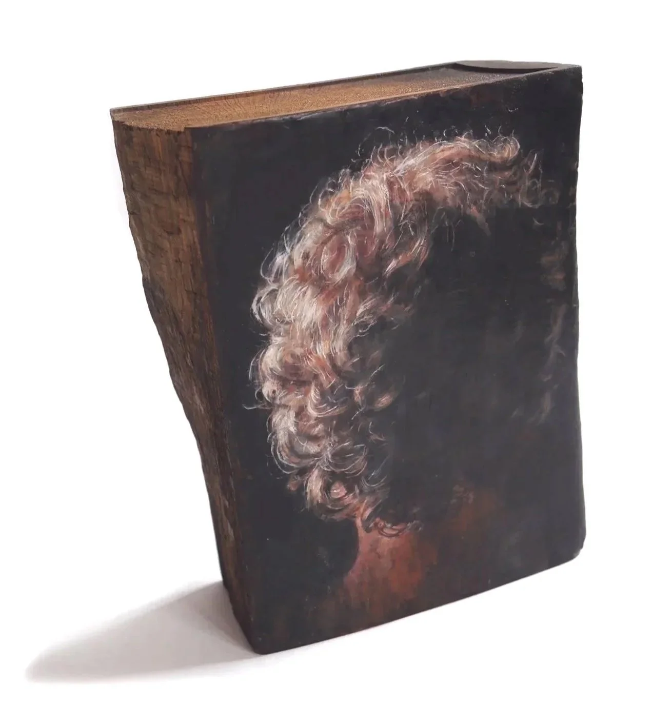 The Book of Neil Gaiman (The Bog Oak Portrait) (Circa 37 x 30 x 10 cm Oil and beeswax on prehistoric bog oak sculpted by artist Adrian Swinstead. 2017)